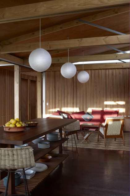 Compson Bach: covered outdoor deck/kitchen/dining area for summer holidays. Block piers and double timber posts hold delicate trusses that provide a structural rhythm that reinforces individual living spaces. Translucent walls enclose private terraces that focus views on beautiful ridgelines rather than joining the jostling water views.